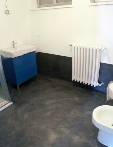Invece per il bagno è stata usata una tecnica diversa perché la committenza aveva richiesto un pavimento resina nera con spatolate di colore bianco.